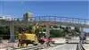 Passerelle en béton armé enjambant la route cantonale RC5 et la voie du tram TransN Littorail. Préfabrication partielle des piles et du tablier et pose à la grue de nuit pour permettre le maintien de la ligne du tram en fonction.